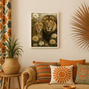 Quadro Arte Leão e Leoa Com Flores 45x34cm - com vidro - Cor: Moldura branca