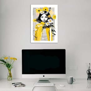 Quadro arte menina margaridas 33x24cm Cor: moldura preta Informações do produto tire todas as suas dúvidas no descritivo abaixo: decoração para quarto, sala, cozinha, escritório, área gourmet e muito mais. Chega de paredes vazias medidas - cada peça tem 33x24cm a4 . Material do papel - papel fotográfico brilhante de altíssima resolução acabamento - todos os quadros são acompanhados de uma película de acetato para proteção da imagem. - os quadros são embalados de forma segura com plástico bolha com camada dupla de acordo com o tamanho dos quadros. Garantia - garantia de 3 meses. Meu quadro chegou. Como posso fixá-lo Você precisa apenas de um martelo e um prego, pois os quadros já vão acompanhados de penduradores. Esta é a forma mais indicada. Caso prefira, você pode utilizar uma fita dupla face neste caso, sugerimos de alta qualidade para evitar que descole e seu quadro caia . Como posso limpar meu quadro A limpeza é feita como um móvel comum da sua casa. Apenas um pano seco ou espanador são suficientes para tal