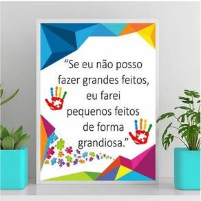 Quadro autismo feitos grandiosos 24x18cm Moldura: madeira branca Informações do produto tire todas as suas dúvidas no descritivo abaixo: decoração para quarto, sala, cozinha, escritório, área gourmet e muito mais. Chega de paredes vazias medidas - cada peça tem 24x18cm a5 . Material do papel - papel fotográfico brilhante de altíssima resolução acabamento - todos os quadros são acompanhados de uma película de acetato para proteção da imagem. - os quadros são embalados de forma segura com plástico bolha com camada dupla de acordo com o tamanho dos quadros. Garantia - garantia de 3 meses. Meu quadro chegou. Como posso fixá-lo Você precisa apenas de um martelo e um prego, pois os quadros já vão acompanhados de penduradores. Esta é a forma mais indicada. Caso prefira, você pode utilizar uma fita dupla face neste caso, sugerimos de alta qualidade para evitar que descole e seu quadro caia . Como posso limpar meu quadro A limpeza é feita como um móvel comum da sua casa. Apenas um pano seco ou espanador são suficientes para tal