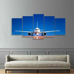 Quadro Avião Mosaico 5 Peças decorativo Dimensões do Produto: Tamanho total do produto: 125x60 cm Comprimento x Altura 02 Peças menores: 25x40 cm 02 Peças Médias: 25x50 cm 01 Peça Central: 25x60 cm. Espaçamento entre as peças de 1 cm - Tamanho total com espaçamentos 129x60 cm. Espessura do produto - 9 mm