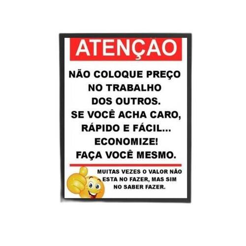 Quadro aviso para clientes sem noção 24x18cm - com vidro Moldura: madeira preta Informações do produto tire todas as suas dúvidas no descritivo abaixo: decoração para quarto, sala, cozinha, escritório, área gourmet e muito mais. Chega de paredes vazias medidas - cada peça tem 24x18cm a5 . Material do papel - papel fotográfico brilhante de altíssima resolução acabamento - todos os quadros são acompanhados de vidro para proteção da imagem. - moldura em madeira maciça na cor preta e pendurador . - os quadros são embalados de forma segura com plástico bolha com camada dupla de acordo com o tamanho dos quadros. - de 3 meses. Meu quadro chegou. Como posso fixá-lo Você precisa apenas de um martelo e um prego, pois os quadros já vão acompanhados de penduradores. Esta é a forma mais indicada. Como posso limpar meu quadro A limpeza é feita como um móvel comum da sua casa. Apenas um pano seco ou espanador são suficientes para tal Marca: Não Informado Ean: 7894104585050