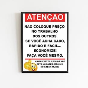 Quadro aviso para clientes sem noção 45x34cm - com vidro Moldura: madeira preta Informações do produto tire todas as suas dúvidas no descritivo abaixo: decoração para quarto, sala, cozinha, escritório, área gourmet e muito mais. Chega de paredes vazias medidas - cada peça tem 45x34cm a3 . Material do papel - papel fotográfico brilhante de altíssima resolução acabamento - todos os quadros são acompanhados de vidro para proteção da imagem. - moldura em madeira maciça na cor preta e pendurador . - os quadros são embalados de forma segura com plástico bolha com camada dupla de acordo com o tamanho dos quadros. Garantia - garantia de 3 meses. Meu quadro chegou. Como posso fixá-lo Você precisa apenas de um martelo e um prego, pois os quadros já vão acompanhados de penduradores. Esta é a forma mais indicada. Como posso limpar meu quadro A limpeza é feita como um móvel comum da sua casa. Apenas um pano seco ou espanador são suficientes para tal Ean: 7899714982572