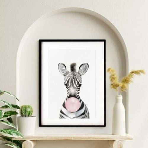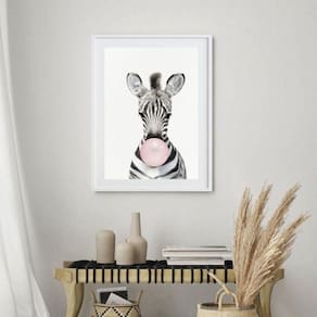 Quadro baby zebra bubble gum - 60x48cm Moldura: madeira branca Informações do produto tire todas as suas dúvidas no descritivo abaixo: decoração para quarto, sala, cozinha, escritório, área gourmet e muito mais. Chega de paredes vazias medidas - cada peça tem 60x48cm . Material do papel - papel fotográfico brilhante de altíssima resolução acabamento - todos os quadros são acompanhados de vidro para proteção da imagem. - moldura em madeira maciça na cor preta ou branca conforme produto escolhido e pendurador. - paspatur branco com 7cm de largura - os quadros são embalados de forma segura com plástico bolha com camada dupla de acordo com o tamanho dos quadros. Garantia - garantia de 3 meses. Meu quadro chegou. Como posso fixá-lo Você precisa apenas de um martelo e um prego, pois os quadros já vão acompanhados de penduradores. Esta é a forma mais indicada. Como posso limpar meu quadro A limpeza é feita como um móvel comum da sua casa. Apenas um pano seco ou espanador são suficientes para tal