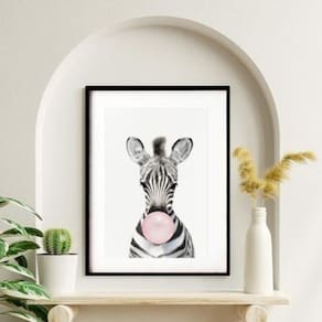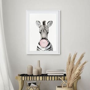 Quadro baby zebra bubble gum - 60x48cm Moldura: madeira preta Informações do produto tire todas as suas dúvidas no descritivo abaixo: decoração para quarto, sala, cozinha, escritório, área gourmet e muito mais. Chega de paredes vazias medidas - cada peça tem 60x48cm . Material do papel - papel fotográfico brilhante de altíssima resolução acabamento - todos os quadros são acompanhados de vidro para proteção da imagem. - moldura em madeira maciça na cor preta ou branca conforme produto escolhido e pendurador. - paspatur branco com 7cm de largura - os quadros são embalados de forma segura com plástico bolha com camada dupla de acordo com o tamanho dos quadros. Garantia - garantia de 3 meses. Meu quadro chegou. Como posso fixá-lo Você precisa apenas de um martelo e um prego, pois os quadros já vão acompanhados de penduradores. Esta é a forma mais indicada. Como posso limpar meu quadro A limpeza é feita como um móvel comum da sua casa. Apenas um pano seco ou espanador são suficientes para tal