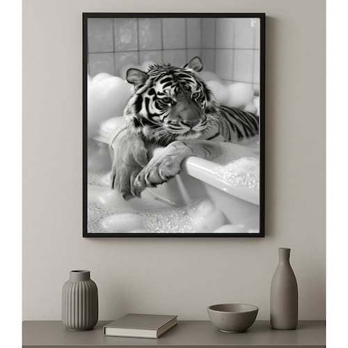 Quadro Banheiro Fotografia Tigre Na Banheira 24x18cm - Cor: Moldura preta