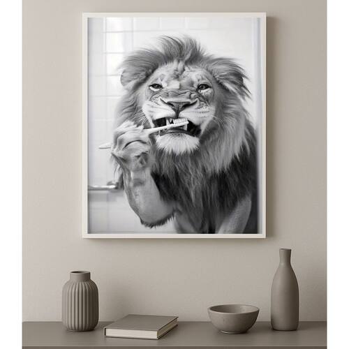 Quadro Banheiro Leão Escovando Dentes 24x18cm - com vidro - Cor: Moldura branca