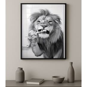Quadro Banheiro Leão Escovando Dentes 24x18cm - Cor: Moldura preta