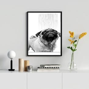 Quadro banheiro - pug tomando banho 33x24cm - com vidro Cor: moldura branca Informações do produto tire todas as suas dúvidas no descritivo abaixo: decoração para quarto, sala, cozinha, escritório, área gourmet e muito mais. Chega de paredes vazias medidas - cada peça tem 33x24cm a4 . Material do papel - papel fotográfico brilhante de altíssima resolução acabamento - todos os quadros são acompanhados de vidro para proteção da imagem. - moldura em madeira maciça na cor preta ou branca conforme produto escolhido e pendurador . - os quadros são embalados de forma segura com plástico bolha com camada dupla de acordo com o tamanho dos quadros. Garantia - garantia de 3 meses. Meu quadro chegou. Como posso fixá-lo Você precisa apenas de um martelo e um prego, pois os quadros já vão acompanhados de penduradores. Esta é a forma mais indicada. Como posso limpar meu quadro A limpeza é feita como um móvel comum da sua casa. Apenas um pano seco ou espanador são suficientes para tal