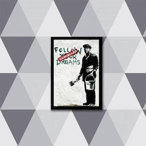Quadro banksy follow your dreams 45x34cm - com vidro Moldura: madeira preta Informações do produto tire todas as suas dúvidas no descritivo abaixo: decoração para quarto, sala, cozinha, escritório, área gourmet e muito mais. Chega de paredes vazias medidas - cada peça tem 45x34cm a3 . Material do papel - papel fotográfico brilhante de altíssima resolução acabamento - todos os quadros são acompanhados de vidro para proteção da imagem. - moldura em madeira maciça na cor preta e pendurador . - os quadros são embalados de forma segura com plástico bolha com camada dupla de acordo com o tamanho dos quadros. Garantia - garantia de 3 meses. Meu quadro chegou. Como posso fixá-lo Você precisa apenas de um martelo e um prego, pois os quadros já vão acompanhados de penduradores. Esta é a forma mais indicada. Como posso limpar meu quadro A limpeza é feita como um móvel comum da sua casa. Apenas um pano seco ou espanador são suficientes para tal