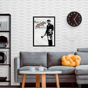 Quadro banksy follow your dreams 45x34cm - com vidro Moldura: madeira preta Informações do produto tire todas as suas dúvidas no descritivo abaixo: decoração para quarto, sala, cozinha, escritório, área gourmet e muito mais. Chega de paredes vazias medidas - cada peça tem 45x34cm a3 . Material do papel - papel fotográfico brilhante de altíssima resolução acabamento - todos os quadros são acompanhados de vidro para proteção da imagem. - moldura em madeira maciça na cor preta e pendurador . - os quadros são embalados de forma segura com plástico bolha com camada dupla de acordo com o tamanho dos quadros. Garantia - garantia de 3 meses. Meu quadro chegou. Como posso fixá-lo Você precisa apenas de um martelo e um prego, pois os quadros já vão acompanhados de penduradores. Esta é a forma mais indicada. Como posso limpar meu quadro A limpeza é feita como um móvel comum da sua casa. Apenas um pano seco ou espanador são suficientes para tal Ean: 7895142163026