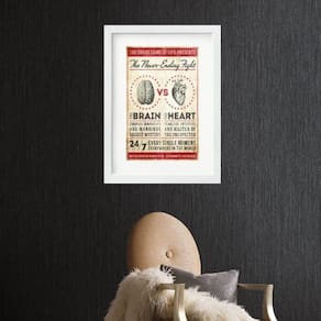 Quadro batalha cérebro x coração - 60x48cm Moldura: madeira branca Informações do produto tire todas as suas dúvidas no descritivo abaixo: decoração para quarto, sala, cozinha, escritório, área gourmet e muito mais. Chega de paredes vazias medidas - cada peça tem 60x48cm . Material do papel - papel fotográfico brilhante de altíssima resolução acabamento - todos os quadros são acompanhados de vidro para proteção da imagem. - moldura em madeira maciça na cor preta ou branca conforme produto escolhido e pendurador. - paspatur branco com 7cm de largura - os quadros são embalados de forma segura com plástico bolha com camada dupla de acordo com o tamanho dos quadros. Garantia - garantia de 3 meses. Meu quadro chegou. Como posso fixá-lo Você precisa apenas de um martelo e um prego, pois os quadros já vão acompanhados de penduradores. Esta é a forma mais indicada. Como posso limpar meu quadro A limpeza é feita como um móvel comum da sua casa. Apenas um pano seco ou espanador são suficientes para tal