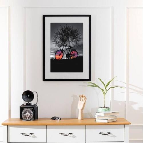 Quadro bicicleta paisagem - 60x48cm Cor: moldura preta Informações do produto tire todas as suas dúvidas no descritivo abaixo: decoração para quarto, sala, cozinha, escritório, área gourmet e muito mais. Chega de paredes vazias medidas - cada peça tem 60x48cm . Material do papel - papel fotográfico brilhante de altíssima resolução acabamento - todos os quadros são acompanhados de vidro para proteção da imagem. - moldura em madeira maciça na cor preta ou branca conforme produto escolhido e pendurador. - paspatur branco com 7cm de largura - os quadros são embalados de forma segura com plástico bolha com camada dupla de acordo com o tamanho dos quadros. Garantia - garantia de 3 meses. Meu quadro chegou. Como posso fixá-lo Você precisa apenas de um martelo e um prego, pois os quadros já vão acompanhados de penduradores. Esta é a forma mais indicada. Como posso limpar meu quadro A limpeza é feita como um móvel comum da sua casa. Apenas um pano seco ou espanador são suficientes para tal