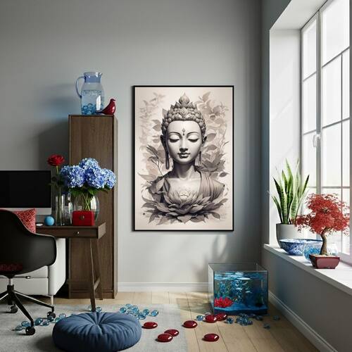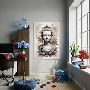 Quadro Buda Tons de Cinza - 70x50cm - Cor: Moldura Branca