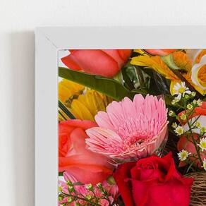 A moldura do quadro é do tipo frontal branca, com acabamento refinado e de excelente qualidade. O tom escuro da moldura cria um contraste perfeito com as cores vibrantes das flores, destacando ainda mais a beleza da obra. O acabamento da moldura é impecável, proporcionando resistência e durabilidade, garantindo que o quadro se mantenha em excelente estado ao longo do tempo, enquanto se integra facilmente a diferentes estilos de decoração.