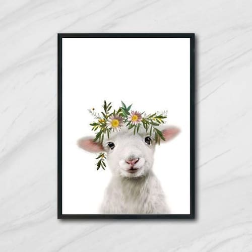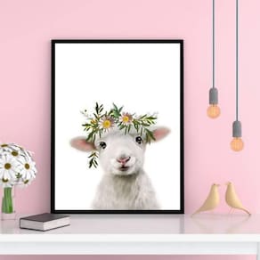 Quadro cabritinho coroa de flores 45x34cm - com vidro Moldura: madeira preta Informações do produto tire todas as suas dúvidas no descritivo abaixo: decoração para quarto, sala, cozinha, escritório, área gourmet e muito mais. Chega de paredes vazias medidas - cada peça tem 45x34cm a3 . Material do papel - papel fotográfico brilhante de altíssima resolução acabamento - todos os quadros são acompanhados de vidro para proteção da imagem. - moldura em madeira maciça na cor preta e pendurador . - os quadros são embalados de forma segura com plástico bolha com camada dupla de acordo com o tamanho dos quadros. - de 3 meses. Meu quadro chegou. Como posso fixá-lo Você precisa apenas de um martelo e um prego, pois os quadros já vão acompanhados de penduradores. Esta é a forma mais indicada. Como posso limpar meu quadro A limpeza é feita como um móvel comum da sua casa. Apenas um pano seco ou espanador são suficientes para tal