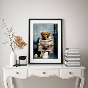 Quadro cachorrinho no banheiro - 60x48cm Moldura: madeira branca Informações do produto tire todas as suas dúvidas no descritivo abaixo: decoração para quarto, sala, cozinha, escritório, área gourmet e muito mais. Chega de paredes vazias medidas - cada peça tem 60x48cm . Material do papel - papel fotográfico brilhante de altíssima resolução acabamento - todos os quadros são acompanhados de vidro para proteção da imagem. - moldura em madeira maciça na cor preta ou branca conforme produto escolhido e pendurador. - paspatur branco com 7cm de largura - os quadros são embalados de forma segura com plástico bolha com camada dupla de acordo com o tamanho dos quadros. Garantia - garantia de 3 meses. Meu quadro chegou. Como posso fixá-lo Você precisa apenas de um martelo e um prego, pois os quadros já vão acompanhados de penduradores. Esta é a forma mais indicada. Como posso limpar meu quadro A limpeza é feita como um móvel comum da sua casa. Apenas um pano seco ou espanador são suficientes para tal