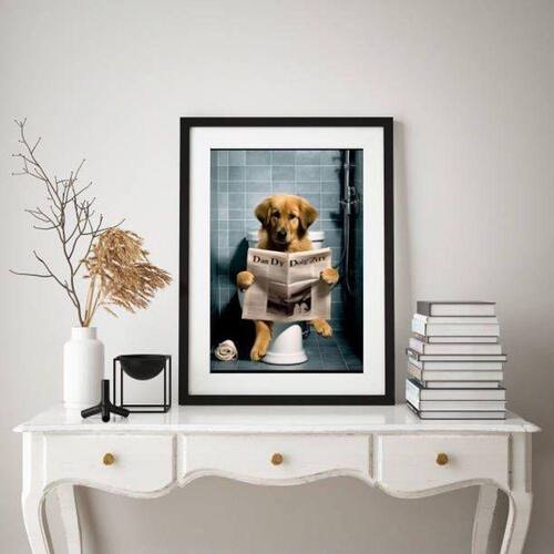 Quadro cachorrinho no banheiro - 60x48cm Moldura: madeira preta Informações do produto tire todas as suas dúvidas no descritivo abaixo: decoração para quarto, sala, cozinha, escritório, área gourmet e muito mais. Chega de paredes vazias medidas - cada peça tem 60x48cm . Material do papel - papel fotográfico brilhante de altíssima resolução acabamento - todos os quadros são acompanhados de vidro para proteção da imagem. - moldura em madeira maciça na cor preta ou branca conforme produto escolhido e pendurador. - paspatur branco com 7cm de largura - os quadros são embalados de forma segura com plástico bolha com camada dupla de acordo com o tamanho dos quadros. Garantia - garantia de 3 meses. Meu quadro chegou. Como posso fixá-lo Você precisa apenas de um martelo e um prego, pois os quadros já vão acompanhados de penduradores. Esta é a forma mais indicada. Como posso limpar meu quadro A limpeza é feita como um móvel comum da sua casa. Apenas um pano seco ou espanador são suficientes para tal