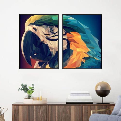 Quadro Canvas Decorativo Para Sala 2 Telas Arara Geométrica 1,30x1,00Nossa impressão em HD a base de solvente garante que as cores sejam brilhantes e não desbotem com o tempo. Impressão fotográfica de alta qualidade em tecido Canvas de algodão, as laterais da tela são recobertas com a própria impressão, sem a necessidade de moldura. A armação em madeira de pinus, vazada, mede 2cm de profundidade.DIMENSÇÕESAltura: 130cmLargura: 100cmProfundidade: 2cmCARACTERÍSTICA DO PRODUTO TELA:- Impressa em tecido Canvas 100% algodão, esticado e grampeado em armação de madeira.- A qualidade do tecido canvas é o mesmo utilizado em obras de arte com impressão de alta resolução a base de solvente.LIMPEZA:- Utilizar espanador ou pano seco e macio. Poderá usar pano ligeiramente úmido, porém sem conter álcool ou produtos químicos.INSTALAÇÃO:- Pendure com prego ou bucha com parafuso.EVITAR- Não deixar exposto a umidade, raios de sol, para garantir maior durabilidade.ATENÇÃOPODE OCORRER UMA LEVE DIFERENÇA NA TONALIDADE DAS CORES IMPRESSAS NO PRODUTO, EM COMPARAÇÃO, AS QUE SÃO VISTAS NA TELA DOS MONITORES OU SMARTPHONES. Marca: LUGGUI ART. FOTOG