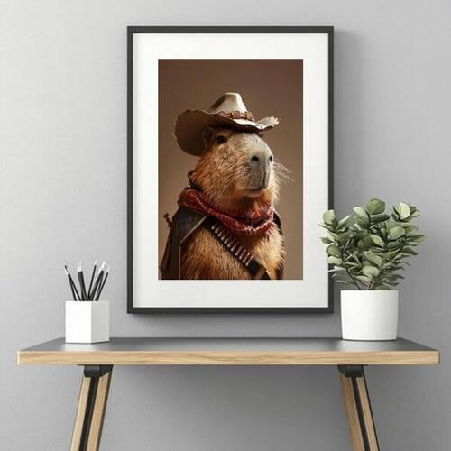 Quadro capivara cowboy - 60x48cm Cor: moldura preta Informações do produto tire todas as suas dúvidas no descritivo abaixo: decoração para quarto, sala, cozinha, escritório, área gourmet e muito mais. Chega de paredes vazias medidas - cada peça tem 60x48cm . Material do papel - papel fotográfico brilhante de altíssima resolução acabamento - todos os quadros são acompanhados de vidro para proteção da imagem. - moldura em madeira maciça na cor preta ou branca conforme produto escolhido e pendurador. - paspatur branco com 7cm de largura - os quadros são embalados de forma segura com plástico bolha com camada dupla de acordo com o tamanho dos quadros. Garantia - garantia de 3 meses. Meu quadro chegou. Como posso fixá-lo Você precisa apenas de um martelo e um prego, pois os quadros já vão acompanhados de penduradores. Esta é a forma mais indicada. Como posso limpar meu quadro A limpeza é feita como um móvel comum da sua casa. Apenas um pano seco ou espanador são suficientes para tal