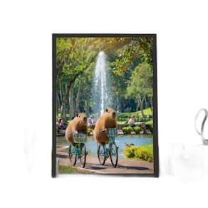 Quadro capivaras andando de bicicleta 45x34cm - com vidro Moldura: madeira preta Informações do produto tire todas as suas dúvidas no descritivo abaixo: decoração para quarto, sala, cozinha, escritório, área gourmet e muito mais. Chega de paredes vazias medidas - cada peça tem 45x34cm a3 . Material do papel - papel fotográfico brilhante de altíssima resolução acabamento - todos os quadros são acompanhados de vidro para proteção da imagem. - moldura em madeira maciça na cor preta ou branca conforme produto escolhido e pendurador . - os quadros são embalados de forma segura com plástico bolha com camada dupla de acordo com o tamanho dos quadros. Garantia - garantia de 3 meses. Meu quadro chegou. Como posso fixá-lo Você precisa apenas de um martelo e um prego, pois os quadros já vão acompanhados de penduradores. Esta é a forma mais indicada. Como posso limpar meu quadro A limpeza é feita como um móvel comum da sua casa. Apenas um pano seco ou espanador são suficientes para tal Ean: 7891703052266