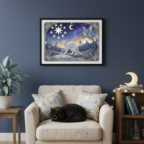 Quadro Carta Tarot Gatos A Estrela 70x50cm Mold Branca