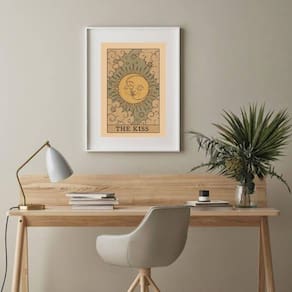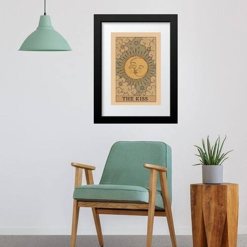Quadro carta tarot kiss sol lua 60x48cm Moldura: madeira preta Informações do produto tire todas as suas dúvidas no descritivo abaixo: decoração para quarto, sala, cozinha, escritório, área gourmet e muito mais. Chega de paredes vazias medidas - cada peça tem 60x48cm . Material do papel - papel fotográfico brilhante de altíssima resolução acabamento - todos os quadros são acompanhados de vidro para proteção da imagem. - moldura em madeira maciça na cor preta ou branca conforme produto escolhido e pendurador. - paspatur branco com 7cm de largura - os quadros são embalados de forma segura com plástico bolha com camada dupla de acordo com o tamanho dos quadros. Garantia - garantia de 3 meses. Meu quadro chegou. Como posso fixá-lo Você precisa apenas de um martelo e um prego, pois os quadros já vão acompanhados de penduradores. Esta é a forma mais indicada. Como posso limpar meu quadro A limpeza é feita como um móvel comum da sua casa. Apenas um pano seco ou espanador são suficientes para tal