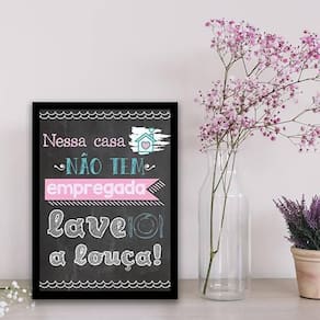 Quadro casa não tem empregada. Lave a louça 24x18cm Moldura: madeira preta Informações do produto tire todas as suas dúvidas no descritivo abaixo: decoração para quarto, sala, cozinha, escritório, área gourmet e muito mais. Chega de paredes vazias medidas - cada peça tem 24x18cm a5 . Material do papel - papel fotográfico brilhante de altíssima resolução acabamento - todos os quadros são acompanhados de uma película de acetato para proteção da imagem. - moldura em madeira maciça na cor branca e pendurador móvel que pode ser retirado facilmente caso deseje fixar com fita dupla face. - os quadros são embalados de forma segura com plástico bolha com camada dupla de acordo com o tamanho dos quadros. Garantia - garantia de 3 meses prazo de envio pedimos 24 horas úteis no máximo para enviar seu pedido após o envio, segue os prazos normais dos correios, cerca de 7 dias úteis exceto para norte e nordeste, que pode ser de até 14 dias úteis. Em diversas cidades, este prazo normalmente é reduzido, mas depende do prazo dos correios. Meu quadro chegou. Como posso fixá-lo Você precisa apenas de um martelo e um prego, pois os quadros já vão acompanhados de penduradores. Esta é a forma mais indicada. Caso prefira, você pode utilizar uma fita dupla face neste caso, sugerimos de alta qualidade para evitar que descole e seu quadro caia . Como posso limpar meu quadro A limpeza é feita como um móvel comum da sua casa. Apenas um pano seco ou espanador são suficientes para tal Ean: 7892091052685