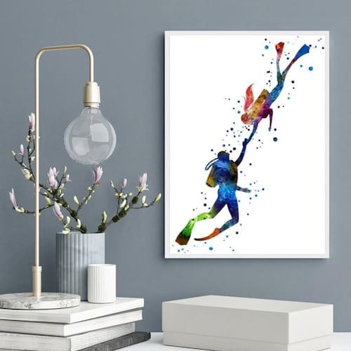 Quadro Casal De Mergulhadores - Aquarela 24X18Cm