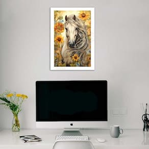 Quadro cavalo com girassóis 45x34cm - com vidro Cor: moldura branca Informações do produto tire todas as suas dúvidas no descritivo abaixo: decoração para quarto, sala, cozinha, escritório, área gourmet e muito mais. Chega de paredes vazias medidas - cada peça tem 45x34cm a3 . Material do papel - papel fotográfico brilhante de altíssima resolução acabamento - todos os quadros são acompanhados de vidro para proteção da imagem. - moldura em madeira maciça na cor preta ou branca conforme produto escolhido e pendurador . - os quadros são embalados de forma segura com plástico bolha com camada dupla de acordo com o tamanho dos quadros. Garantia - garantia de 3 meses. Meu quadro chegou. Como posso fixá-lo Você precisa apenas de um martelo e um prego, pois os quadros já vão acompanhados de penduradores. Esta é a forma mais indicada. Como posso limpar meu quadro A limpeza é feita como um móvel comum da sua casa. Apenas um pano seco ou espanador são suficientes para tal