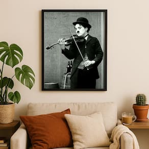 Quadro Charlie Chaplin Tocando Violino 24x18cm - com vidro - Cor: Moldura preta
