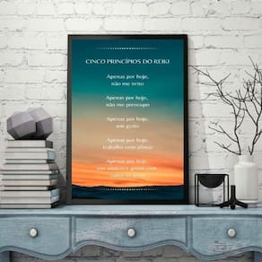 Quadro cinco princípios do reiki 33x24cm Moldura: madeira branca Informações do produto tire todas as suas dúvidas no descritivo abaixo: decoração para quarto, sala, cozinha, escritório, área gourmet e muito mais. Chega de paredes vazias medidas - cada peça tem 33x24cm a4 . Material do papel - papel fotográfico brilhante de altíssima resolução acabamento - todos os quadros são acompanhados de uma película de acetato para proteção da imagem. - os quadros são embalados de forma segura com plástico bolha com camada dupla de acordo com o tamanho dos quadros. Garantia - garantia de 3 meses. Meu quadro chegou. Como posso fixá-lo Você precisa apenas de um martelo e um prego, pois os quadros já vão acompanhados de penduradores. Esta é a forma mais indicada. Caso prefira, você pode utilizar uma fita dupla face neste caso, sugerimos de alta qualidade para evitar que descole e seu quadro caia . Como posso limpar meu quadro A limpeza é feita como um móvel comum da sua casa. Apenas um pano seco ou espanador são suficientes para tal