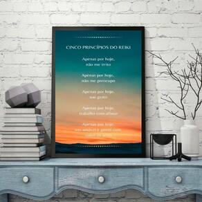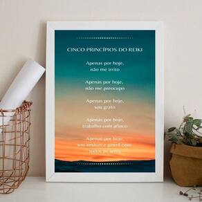 Quadro cinco princípios do reiki 45x34cm - com vidro Moldura: madeira branca Informações do produto tire todas as suas dúvidas no descritivo abaixo: decoração para quarto, sala, cozinha, escritório, área gourmet e muito mais. Chega de paredes vazias medidas - cada peça tem 45x34cm a3 . Material do papel - papel fotográfico brilhante de altíssima resolução acabamento - todos os quadros são acompanhados de vidro para proteção da imagem. - moldura em madeira maciça na cor preta ou branca conforme produto escolhido e pendurador . - os quadros são embalados de forma segura com plástico bolha com camada dupla de acordo com o tamanho dos quadros. Garantia - garantia de 3 meses. Meu quadro chegou. Como posso fixá-lo Você precisa apenas de um martelo e um prego, pois os quadros já vão acompanhados de penduradores. Esta é a forma mais indicada. Como posso limpar meu quadro A limpeza é feita como um móvel comum da sua casa. Apenas um pano seco ou espanador são suficientes para tal