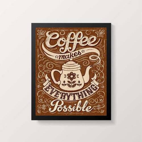 Quadro coffee makes everything possible 24x18cm Moldura: madeira preta Informações do produto tire todas as suas dúvidas no descritivo abaixo: decoração para quarto, sala, cozinha, escritório, área gourmet e muito mais. Chega de paredes vazias medidas - cada peça tem 24x18cm a5 . Material do papel - papel fotográfico brilhante de altíssima resolução acabamento - todos os quadros são acompanhados de uma película de acetato para proteção da imagem. - moldura em madeira maciça na cor branca e pendurador móvel que pode ser retirado facilmente caso deseje fixar com fita dupla face. - os quadros são embalados de forma segura com plástico bolha com camada dupla de acordo com o tamanho dos quadros. - de 3 meses prazo de envio pedimos 24 horas úteis no máximo para enviar seu pedido após o envio, segue os prazos normais dos correios, cerca de 7 exceto para norte e nordeste, que pode ser de até 14 . Em diversas cidades, este prazo normalmente é reduzido, mas depende do prazo dos correios. Meu quadro chegou. Como posso fixá-lo Você precisa apenas de um martelo e um prego, pois os quadros já vão acompanhados de penduradores. Esta é a forma mais indicada. Caso prefira, você pode utilizar uma fita dupla face neste caso, sugerimos de alta qualidade para evitar que descole e seu quadro caia . Como posso limpar meu quadro A limpeza é feita como um móvel comum da sua casa. Apenas um pano seco ou espanador são suficientes para tal