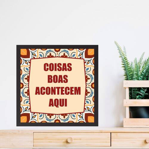 Quadro Coisas Boas Acontecem Aqui - 33x33cm - com vidro - Cor: Moldura Preta