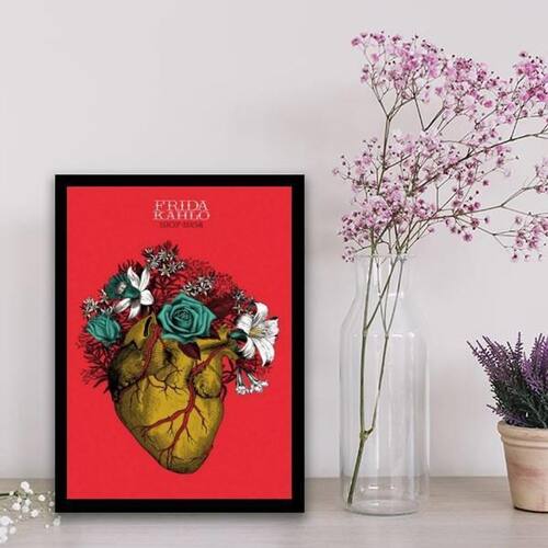 O Quadro Decorativo Coração Frida Khalo 33 x 24 cm A4 é perfeito para a decorar o seu ambiente de forma moderna e charmosa. O quadro é fácil de instalar pois vai acompanhado de pendurador e simples de limpar, apenas um pano seco ou espanador é suficiente para manter o seu quadro conservado. Características: - O papel fotográfico possui alta resolução - Acompanha vidro para proteção da imagem - Fácil de instalar Especificações Marca: Quadros On-Line Temática do quadro: Frida Khalo Modelo: Coração Frida Khalo Material do papel: Fotográfico brilhante Material da moldura: Madeira Acompanha moldura: Sim Acompanha vidro: Sim Acompanha pendurador: Sim Cor da moldura: Preta Medidas: 33 x 24 cm : 3 meses Itens inclusos 01 Quadro Decorativo Coração Frida Khalo 33 x 24 cm