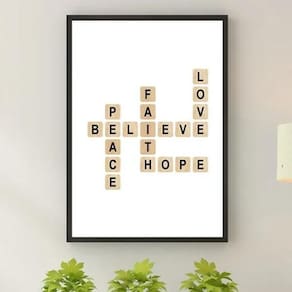 Quadro cruzadinha believe faith peace hope love 33x24cm - com vidro Cor: moldura branca Informações do produto tire todas as suas dúvidas no descritivo abaixo: decoração para quarto, sala, cozinha, escritório, área gourmet e muito mais. Chega de paredes vazias medidas - cada peça tem 33x24cm a4 . Material do papel - papel fotográfico brilhante de altíssima resolução acabamento - todos os quadros são acompanhados de vidro para proteção da imagem. - moldura em madeira maciça na cor preta ou branca conforme produto escolhido e pendurador . - os quadros são embalados de forma segura com plástico bolha com camada dupla de acordo com o tamanho dos quadros. Garantia - garantia de 3 meses. Meu quadro chegou. Como posso fixá-lo Você precisa apenas de um martelo e um prego, pois os quadros já vão acompanhados de penduradores. Esta é a forma mais indicada. Como posso limpar meu quadro A limpeza é feita como um móvel comum da sua casa. Apenas um pano seco ou espanador são suficientes para tal
