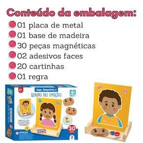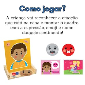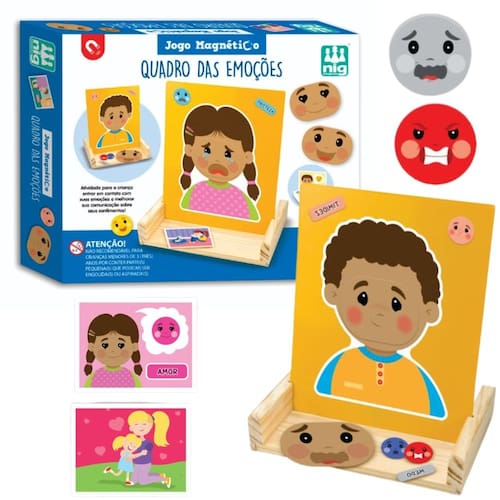 Quadro das Emoções, nesse jogo a criança retira uma cartinha, reconhece a emoção que está na cena e monta seu painel magnético. São 30 peças de imã com o nome do sentimento, seus emojis e as expressões faciais. Esse jogo é uma ferramenta de ajuda para pais e cuidadores decifrarem a linguagem infantil. Jogando, ela coloca em palavras o que sente e busca ajuda quando tiver dificuldades.