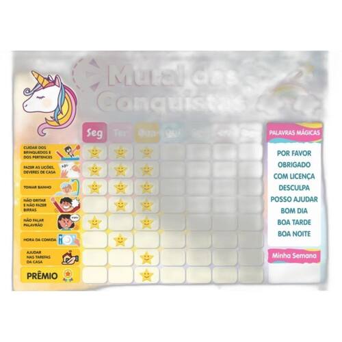 Incluso: Quadro tema unicórnio; Imãs de tarefas; Imãs em branco para escrever outras tarefas ou o nome da criança ; 1 manual.