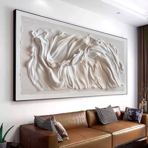 Quadro Decorativo Abstrato Tecido Branco Moldura Preta e Vidro - 180x105cm -