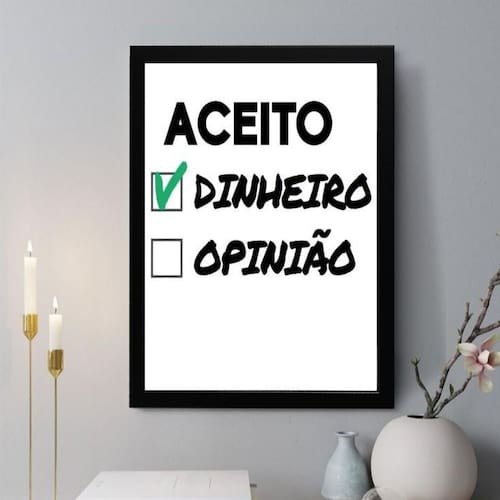 Quadro decorativo aceito dinheiro x opinião 33x24cm - com vidro Cor: moldura branca Informações do produto tire todas as suas dúvidas no descritivo abaixo: decoração para quarto, sala, cozinha, escritório, área gourmet e muito mais. Chega de paredes vazias medidas - cada peça tem 33x24cm a4 . Material do papel - papel fotográfico brilhante de altíssima resolução acabamento - todos os quadros são acompanhados de vidro para proteção da imagem. - moldura em madeira maciça na cor preta ou branca conforme produto escolhido e pendurador . - os quadros são embalados de forma segura com plástico bolha com camada dupla de acordo com o tamanho dos quadros. - de 3 meses. Meu quadro chegou. Como posso fixá-lo Você precisa apenas de um martelo e um prego, pois os quadros já vão acompanhados de penduradores. Esta é a forma mais indicada. Como posso limpar meu quadro A limpeza é feita como um móvel comum da sua casa. Apenas um pano seco ou espanador são suficientes para tal