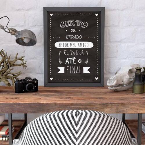 Com o Quadro Decorativo da Quadros On-Line você transforma a decoração do seu ambiente, com beleza e bom gosto. Preencha aquela parede vazia com um quadro de alta qualidade, papel fotográfico brilhante de altíssima resolução e moldura em madeira maciça. Para maior proteção, a peça ainda conta com uma película de acetato. Características: - Papel fotográfico brilhante de altíssima resolução - Película de acetato para proteção da imagem - Moldura em madeira maciça - Pendurador móvel que pode ser retirado facilmente - Pode ser fixado com fita dupla face Especificações técnicas Marca: Quadros On-Line Modelo: Amigo Até O Final Material: Papel fotográfico brilhante Acabamento: Película de acetato Moldura: Madeira Cor moldura: Preto Tamanho: 45 x 34 cm - A3 Fixação: Prego ou fita dupla face de alta qualidade Acompanha pendurador: Sim : 3 meses Dica de limpeza A limpeza é feita como um móvel comum da sua casa. Apenas um pano seco ou espanador são suficientes para tal.