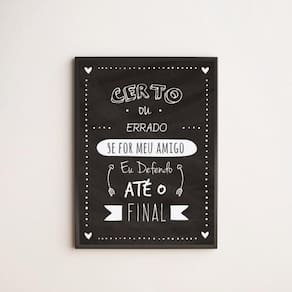 Com o Quadro Decorativo da Quadros On-Line você transforma a decoração do seu ambiente, com beleza e bom gosto. Preencha aquela parede vazia com um quadro de alta qualidade, papel fotográfico brilhante de altíssima resolução e moldura em madeira maciça. Para maior proteção, a peça ainda conta com uma película de acetato. Características: - Papel fotográfico brilhante de altíssima resolução - Película de acetato para proteção da imagem - Moldura em madeira maciça - Pendurador móvel que pode ser retirado facilmente - Pode ser fixado com fita dupla face Especificações técnicas Marca: Quadros On-Line Modelo: Amigo Até O Final Material: Papel fotográfico brilhante Acabamento: Película de acetato Moldura: Madeira Cor moldura: Preto Tamanho: 45 x 34 cm - A3 Fixação: Prego ou fita dupla face de alta qualidade Acompanha pendurador: Sim : 3 meses Dica de limpeza A limpeza é feita como um móvel comum da sua casa. Apenas um pano seco ou espanador são suficientes para tal. Marca: Não Informado