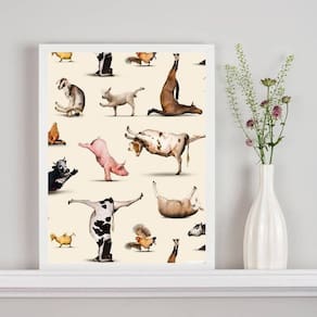 Quadro decorativo animais fazendo yoga 45x34cm - com vidro Moldura: madeira branca Informações do produto tire todas as suas dúvidas no descritivo abaixo: decoração para quarto, sala, cozinha, escritório, área gourmet e muito mais. Chega de paredes vazias medidas - cada peça tem 45x34cm a3 . Material do papel - papel fotográfico brilhante de altíssima resolução acabamento - todos os quadros são acompanhados de vidro para proteção da imagem. - moldura em madeira maciça na cor preta ou branca conforme produto escolhido e pendurador . - os quadros são embalados de forma segura com plástico bolha com camada dupla de acordo com o tamanho dos quadros. Garantia - garantia de 3 meses. Meu quadro chegou. Como posso fixá-lo Você precisa apenas de um martelo e um prego, pois os quadros já vão acompanhados de penduradores. Esta é a forma mais indicada. Como posso limpar meu quadro A limpeza é feita como um móvel comum da sua casa. Apenas um pano seco ou espanador são suficientes para tal