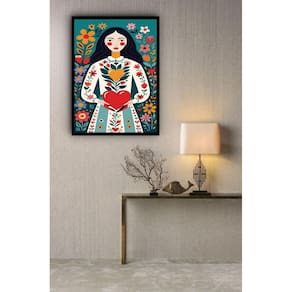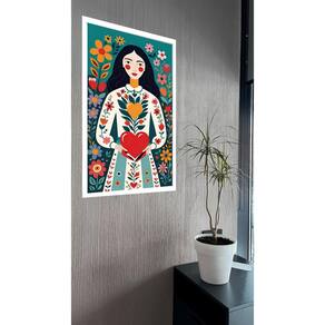 Quadro Decorativo Art Folk Mulher Flores Coração - 70X50Cm