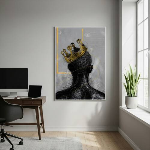 Quadro Decorativo Arte Abstrata Negro Com Coroa - 70x50cm - Cor: Moldura Branca