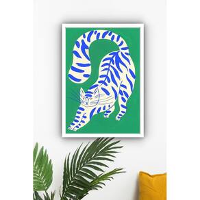 Quadro Decorativo Arte Gato Fundo Verde - 70x50cm - Cor: Moldura Branca