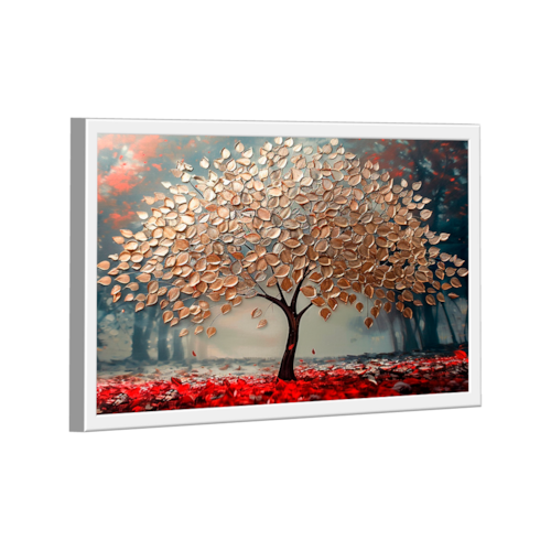 Quadro Decorativo Árvore Dourada com Lindas Folhas Moldura Branca - 84x54cm -