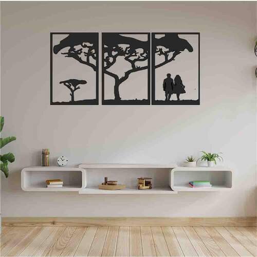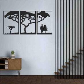 Tamanho total: 122cm comprimento x 60cm altura com espaçamento recomendado de 1 cm entre peças, Peças laterais: 60x40 cm peça central: 60x40 cm Espaçamento entre as peças: 1 cm A instalação é bem simples, não será preciso fazer sujeira furando a parede pois utilizamos o método bem prático para instalar, contém fita dupla face 3m no verso do quadro.