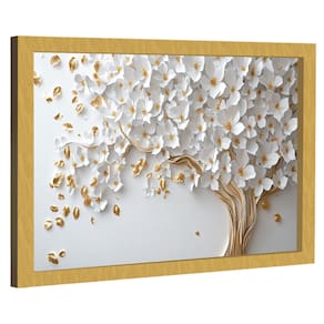 Quadro Decorativo Árvore Elegante Folhas Brancas Moldura Dourada - 84x54cm -