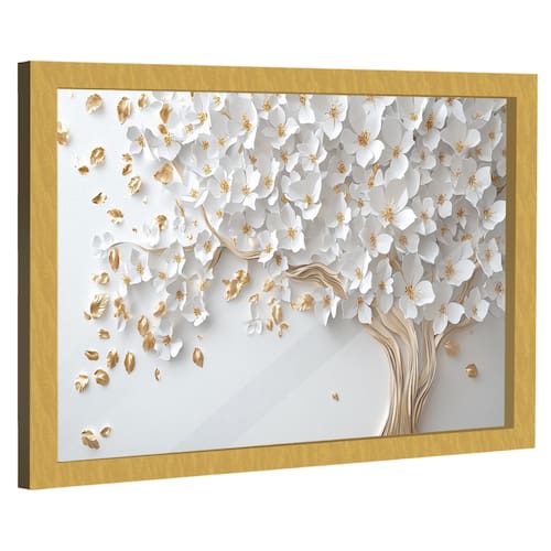 Quadro Decorativo Árvore Elegante Folhas Brancas Moldura Dourada e Vidro - 180x105cm -